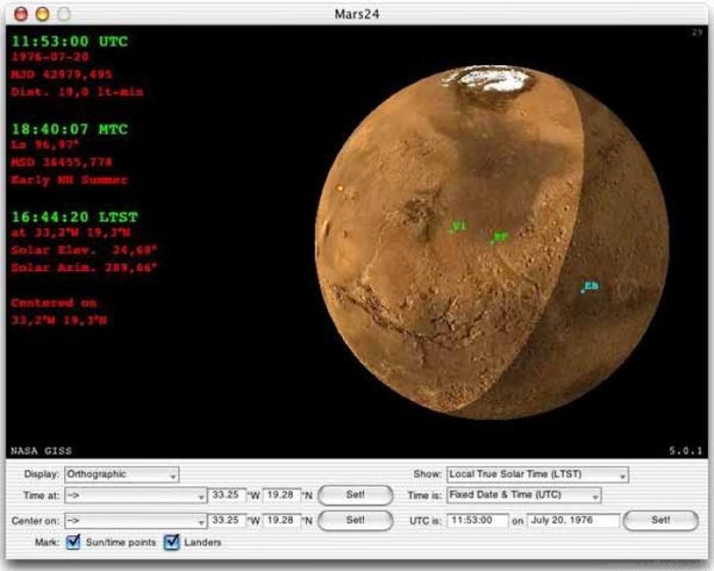 Mars24 nos ofrece la posibilidad de visualizar las posiciones de Marte y la Tierra, en sus respectivas orbitas, junto a un diagrama mostrando el ángulo solar para una ubicación dada en la superficie de Marte